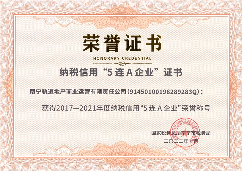 【喜報(bào)】誠(chéng)信納稅 守法經(jīng)營(yíng)!軌道地產(chǎn)商業(yè)公司榮獲納稅信用“5連A”企業(yè)榮譽(yù)