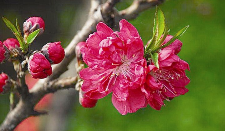 桃花,屬薔薇科,落葉小喬木,高可達(dá)6一8米。樹干灰褐色,粗糙有孔。小枝紅褐色或褐綠色,平滑。葉橢圓狀披針形,邊緣有細(xì)鋸齒;▎紊邪、粉紅、紅等色,重瓣或半重瓣,花期3月。核果近球形,表面密被短絨毛,因品種不同,果熟6一9月。