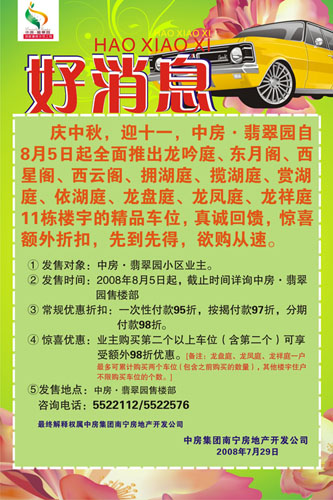 慶中秋,迎十一,中房·翡翠園自85日起全面推出龍吟庭、東月閣、西星閣、西云閣、擁湖庭、攬湖庭、賞湖庭、依湖庭、龍盤庭、龍鳳庭、龍祥庭11棟樓宇的精品車位,真誠回饋,驚喜額外折扣,先到先得,欲購從速。