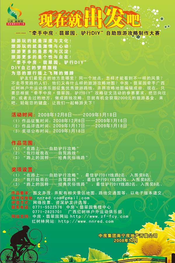 現(xiàn)在,只要您根據(jù)“牽手中房·翡翠園,驢行DIY”攻略征文活動的參賽要求,把您向往的、或者去過的地方,做成路線攻略,您就有機會獲取2000元的現(xiàn)金大獎。來吧,輕敲您的鍵盤,讓我們一起暢游天下!